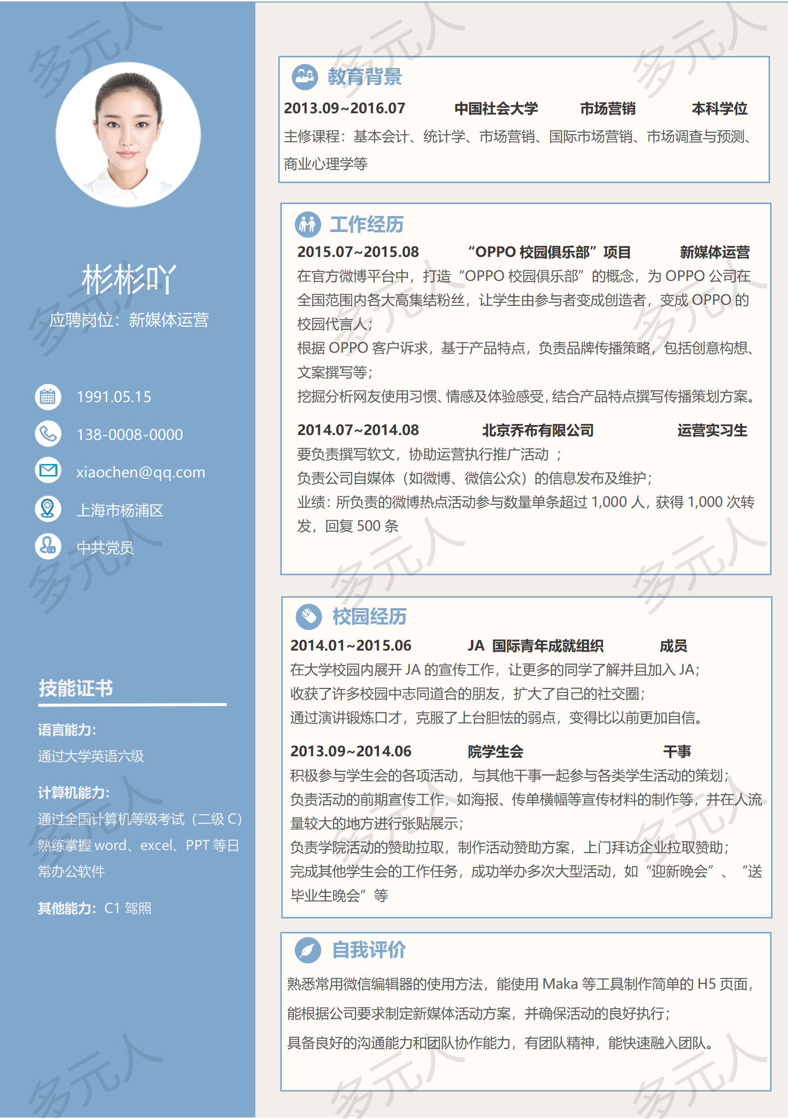此为一份文艺清新风格的新媒体运营岗位简历模板,以蓝色为主色调,简洁大方。左侧有个人照片和联系方式,右侧详细列出了教育背景、工作经历、校园经历、技能证书和自我评价等内容。
