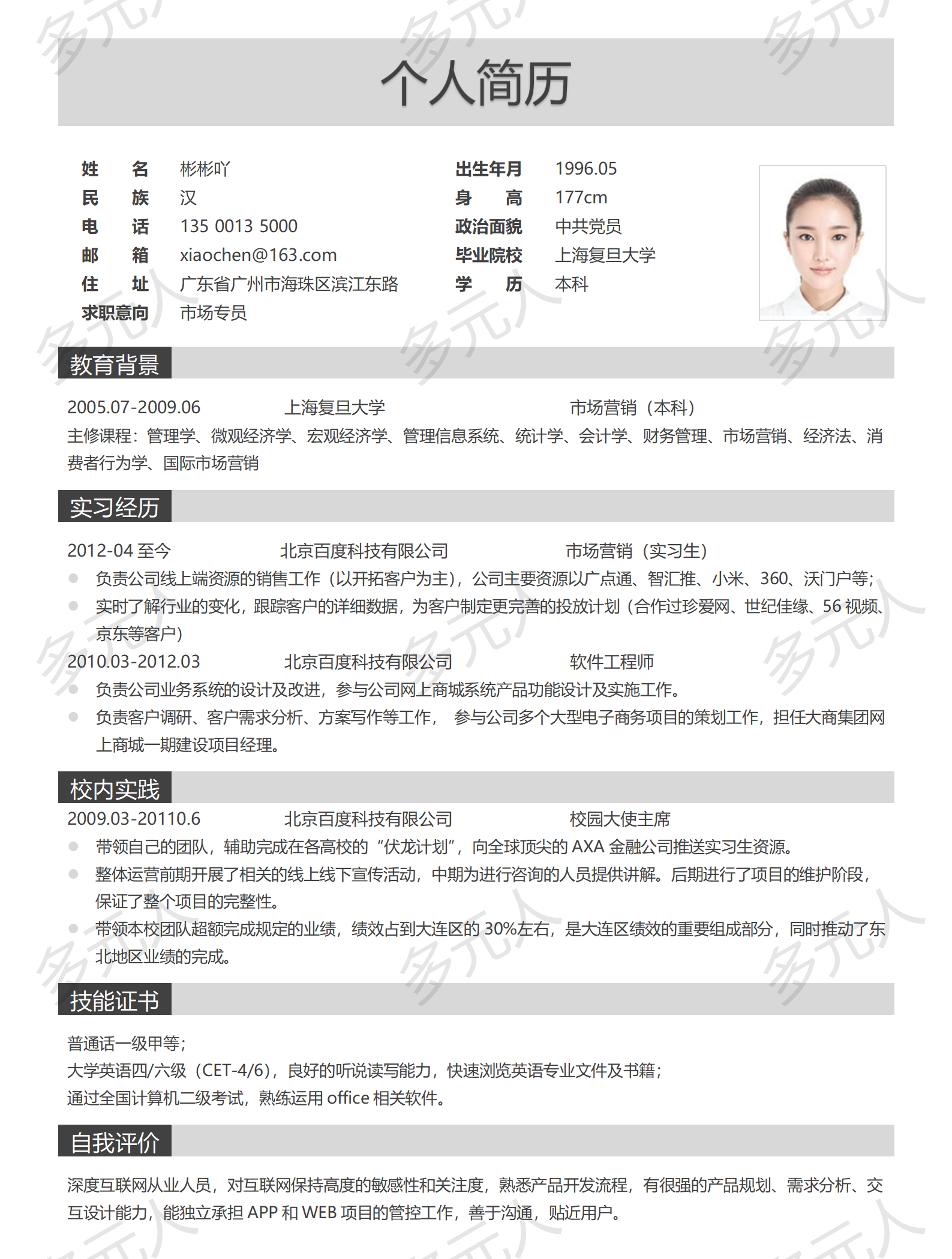 描述:此为一份简洁专业的市场营销岗位简历模板,整体采用经典的黑白灰色调,排版清晰规整。上方居中为“个人简历”标题,右侧预留照片位。主体部分依次列出个人基本信息、求职意向,并分板块详细呈现教育背景、实习经历、校内实践、技能证书和自我评价等内容,适合市场营销、市场专员等岗位的求职者直接下载使用。
