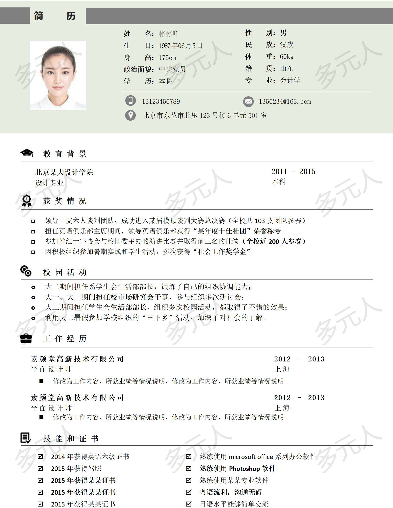 描述:此为一份适用于多行业的通用型简历模板,采用简洁实用的设计风格。模板以白色为背景,通过灰色分隔线清晰划分各个模块,包含个人基本信息、教育背景、获奖情况、校园活动、工作经历、技能证书等完整内容板块。特别值得一提的是模板已填充详细的示例内容,包括具体的工作经历描述和获奖成就,为求职者提供了很好的内容参考范例,下载后可直接编辑使用。