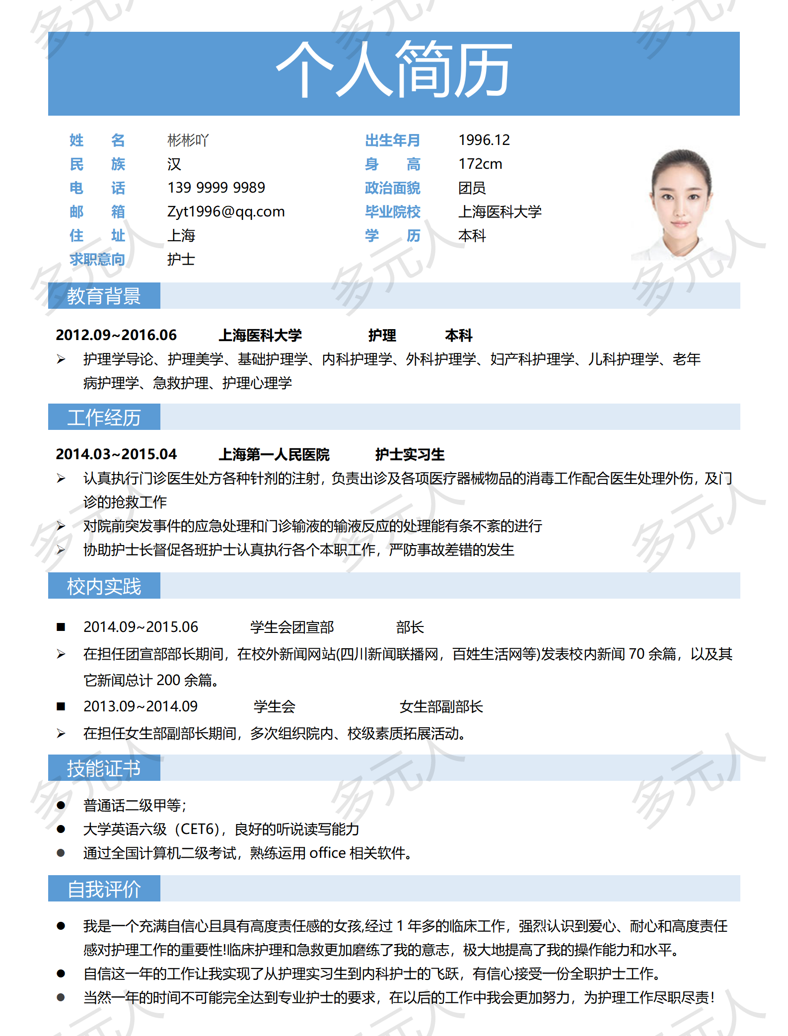 描述:此为一份专为护理专业求职者设计的专业简洁风格简历模板,采用白色背景搭配蓝色标题栏,整体版面清晰规整。模板顶部为"个人简历"标题,下方依次排列个人基本信息、求职意向,并以板块形式系统呈现教育背景、工作经历、校内实践、技能证书和自我评价等核心内容。特别值得一提的是模板已包含完整的护理专业示例内容,详细展示了护士实习经历、专业技能和个性化的自我评价,为医疗护理行业的求职者提供了实用的内容参考。