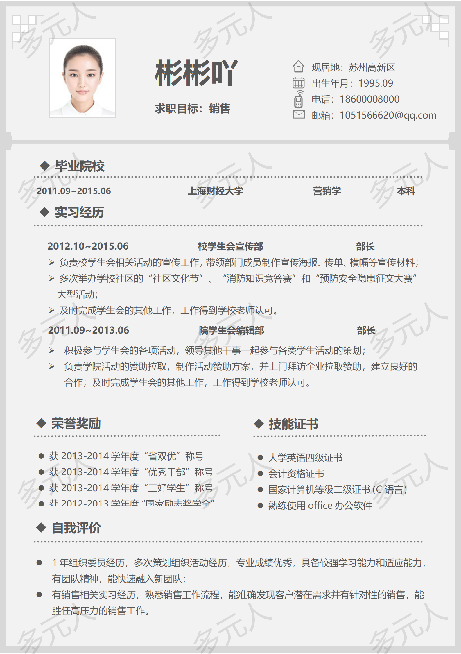 描述:此为一份专为销售岗位打造的简约商务风格简历模板,采用白色背景搭配灰色分隔线,整体排版规整清晰。模板上方左侧设有个人照片位,右侧依次排列求职目标、现居地、联系方式等基本信息。内容部分系统展示毕业院校、实习经历、荣誉奖励、技能证书和自我评价等模块,各板块配有小图标标识,布局层次分明。特别值得一提的是模板已包含完整的销售岗位求职示例内容,详细展示了校园实践经历、专业技能和个人优势,为销售类岗位求职者提供了实用的内容参考。