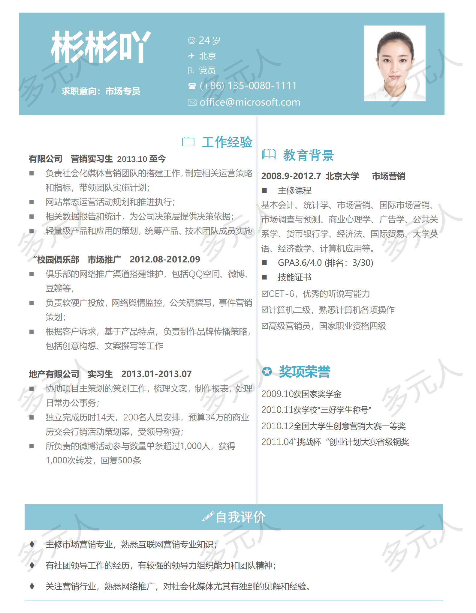 描述:此为一款专为市场营销岗位设计的简约大气风格简历模板,采用蓝白配色方案,整体版面清爽专业。模板采用创新的左右分栏布局,左侧集中展示个人基本信息、自我评价、教育背景和技能证书,右侧重点呈现工作经验与奖励荣誉。特别值得一提的是,模板已包含完整的市场营销求职示例内容,详细展示了实习经历、项目成果和专业技能,为市场营销、品牌推广等相关岗位的求职者提供了专业的内容参考范本。