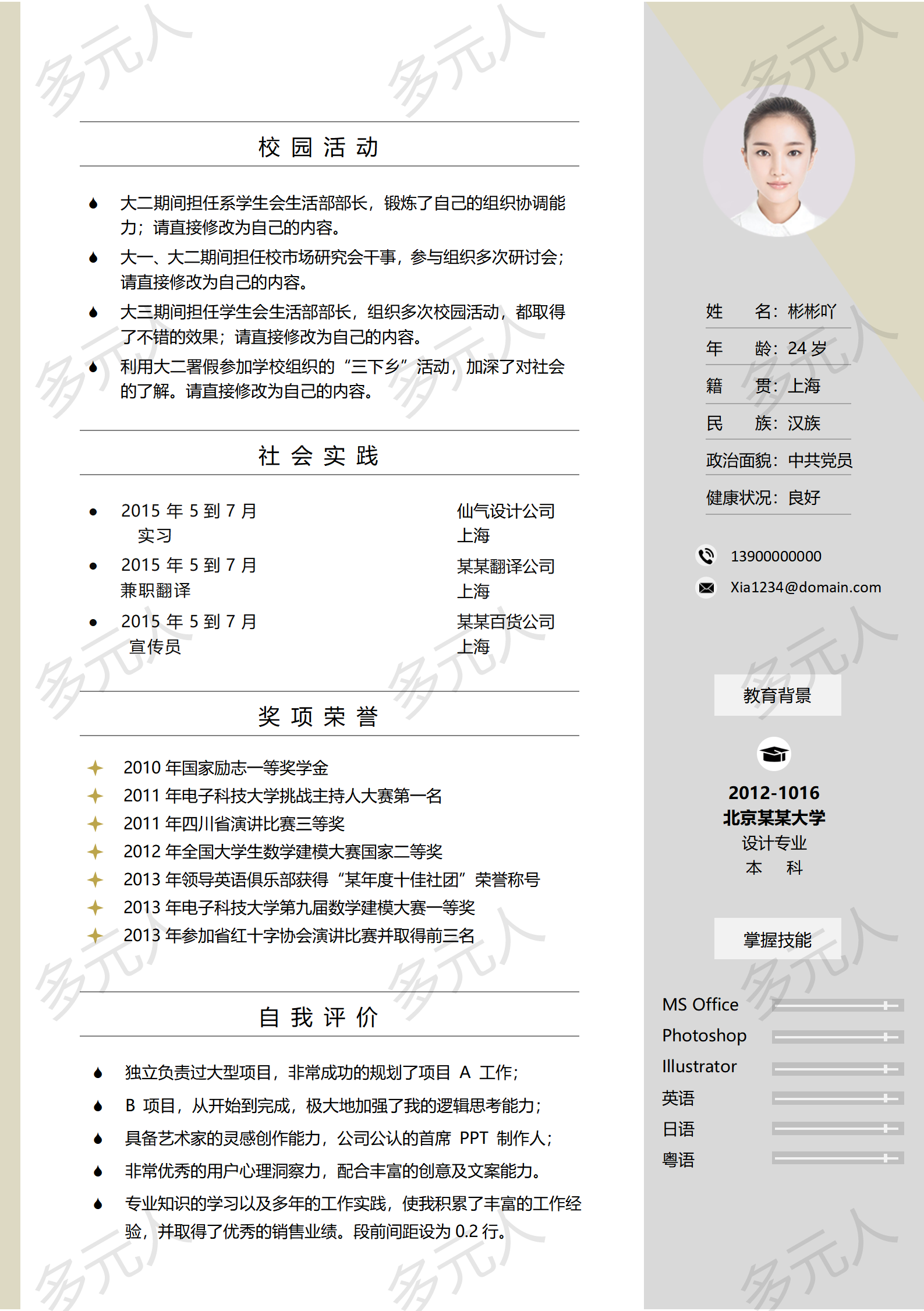 描述:此为一份简约大气的多岗位通用简历模板,采用清晰的左右分栏布局。左侧集中展示个人基本信息、教育背景和掌握技能,右侧系统呈现校园活动、社会实践、奖项荣誉和自我评价等核心内容。模板以白色为底,搭配浅蓝色区块和灰色分隔线,整体版面清爽易读。特别值得一提的是模板已填充完整的示例内容,包括详细的社会实践经历、获奖情况和技能描述,为各行业求职者提供了实用的内容参考范本,下载后可直接编辑使用。