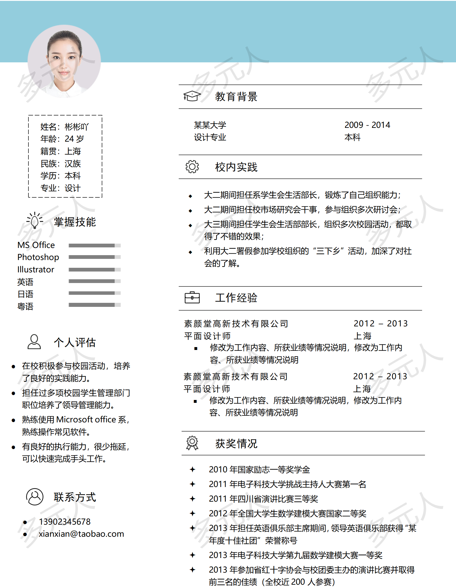 描述:此为一份专为平面设计及相关创意岗位打造的简约专业风格简历模板。模板采用清晰的左右分栏布局,左侧以浅蓝色区块突出展示个人基本信息和核心技能,右侧系统呈现教育背景、工作经历、获奖情况等详细内容。整体采用白色背景搭配浅蓝色点缀,版面简洁大方,特别突出了设计岗位所需的软件技能和项目经验。模板已包含完整的示例内容,包括详细的工作经历描述和丰富的获奖情况展示,为设计行业求职者提供了专业的内容参考范本,可直接下载编辑使用。