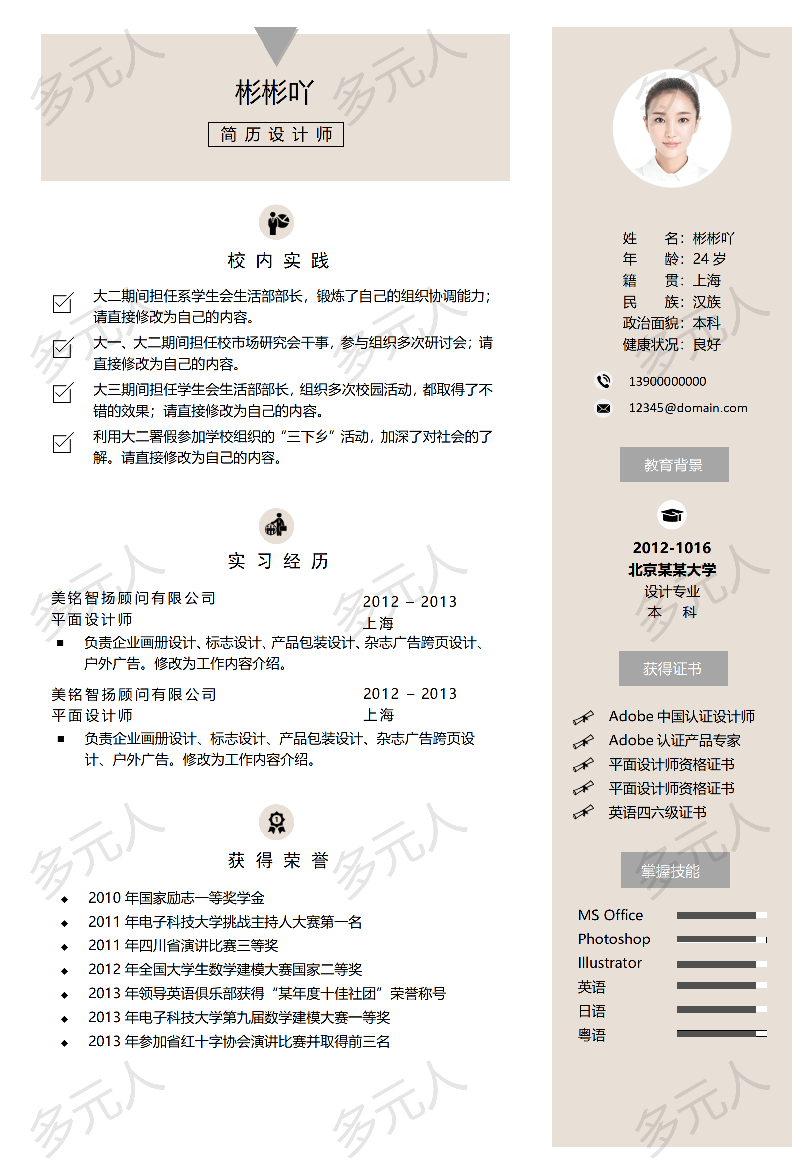 描述:此为一份专为简历设计师及相关创意岗位打造的简约大气风格简历模板。模板以浅米色和白色为主色调,采用清晰的左右分栏布局,左侧重点展示校内实践、实习经历和获得荣誉,右侧系统呈现个人信息、教育背景、获得证书和掌握技能。整体版面设计专业大方,特别突出了简历设计师所需的多元化技能和丰富实践经验,模板已包含完整的示例内容,为设计行业求职者提供了专业的内容参考范本,可直接下载编辑使用。
